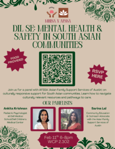 Join us for a panel with AFSSA (Asian Family Support Services of Austin) and MHISA (Mental Health Initiative for South Asians) on culturally responsive support for South Asian communities. Learn how to navigate culturally relevant resources and pathways to care. Free food will be provided!